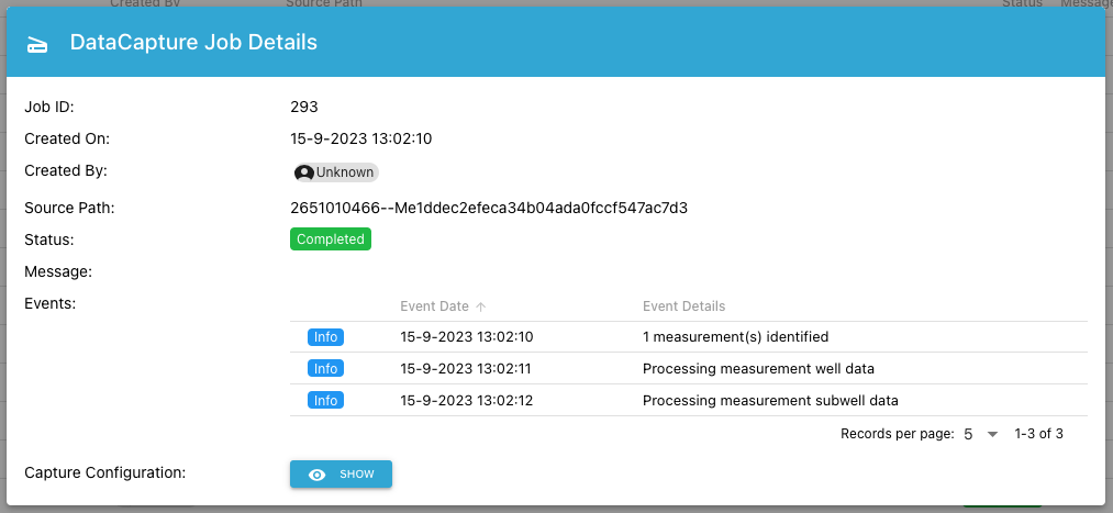 - By clicking on the Details button in the Capture Jobs* overview table a pop-up dialog will appear containing the information about the selected Capture Job