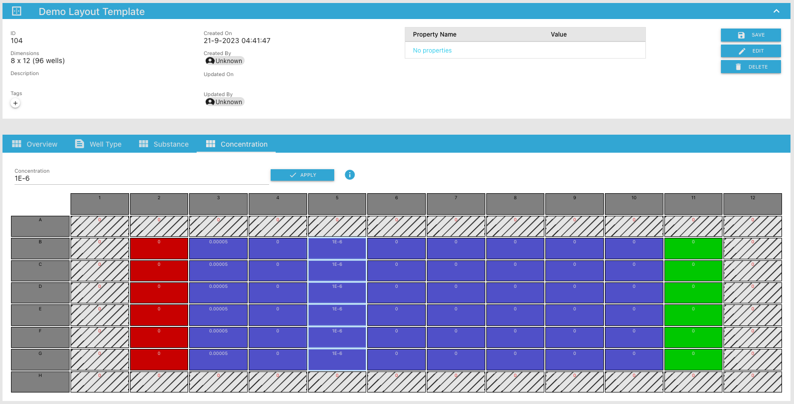 A plate layout template defines how the plate looks like, for example a plate layout can define witch wells are marked as control wells (high/low control) and which wells are marked as sample wells. Next to well type definition, the user can also for every well set a substance type and number of even enter substance concentration. This plate layout templates can later be applied/linked on existing plates as plate definition.
