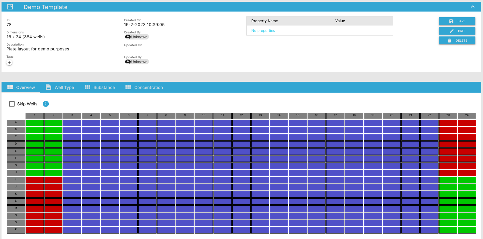 - To view the details of a specific plate layout template click on one of the rows (e.g. previously created)