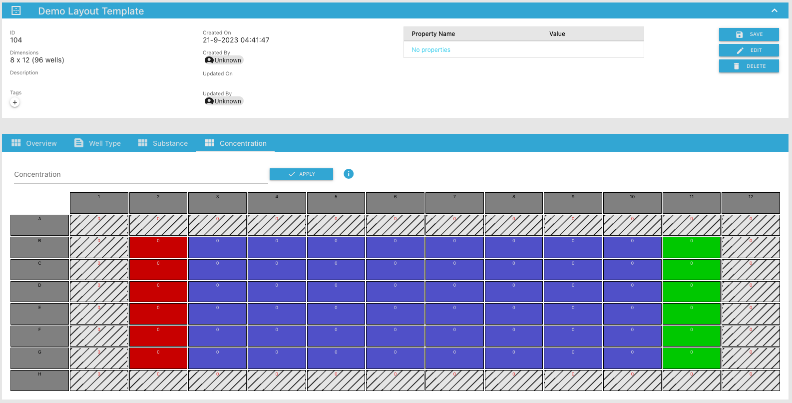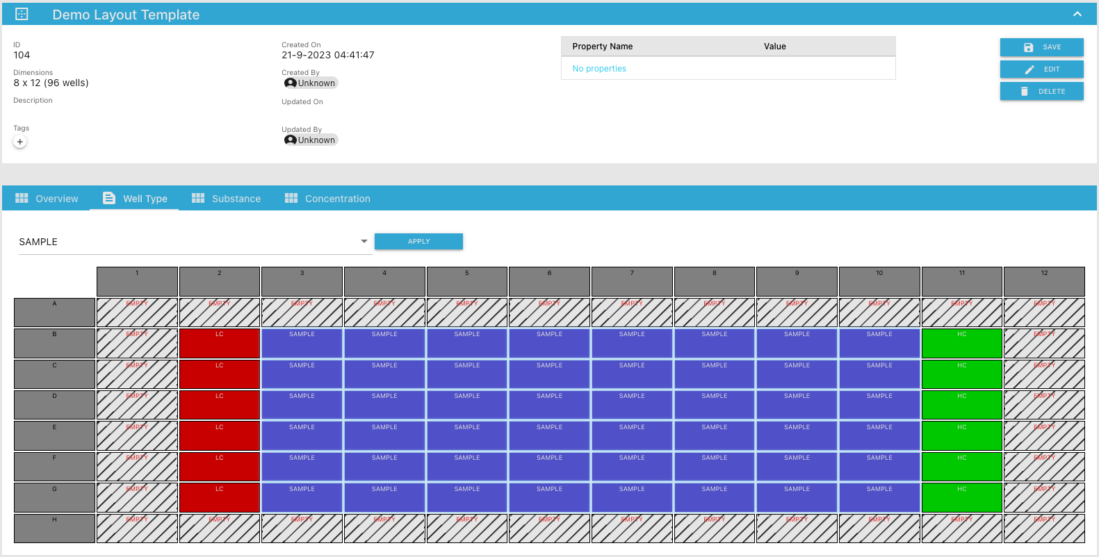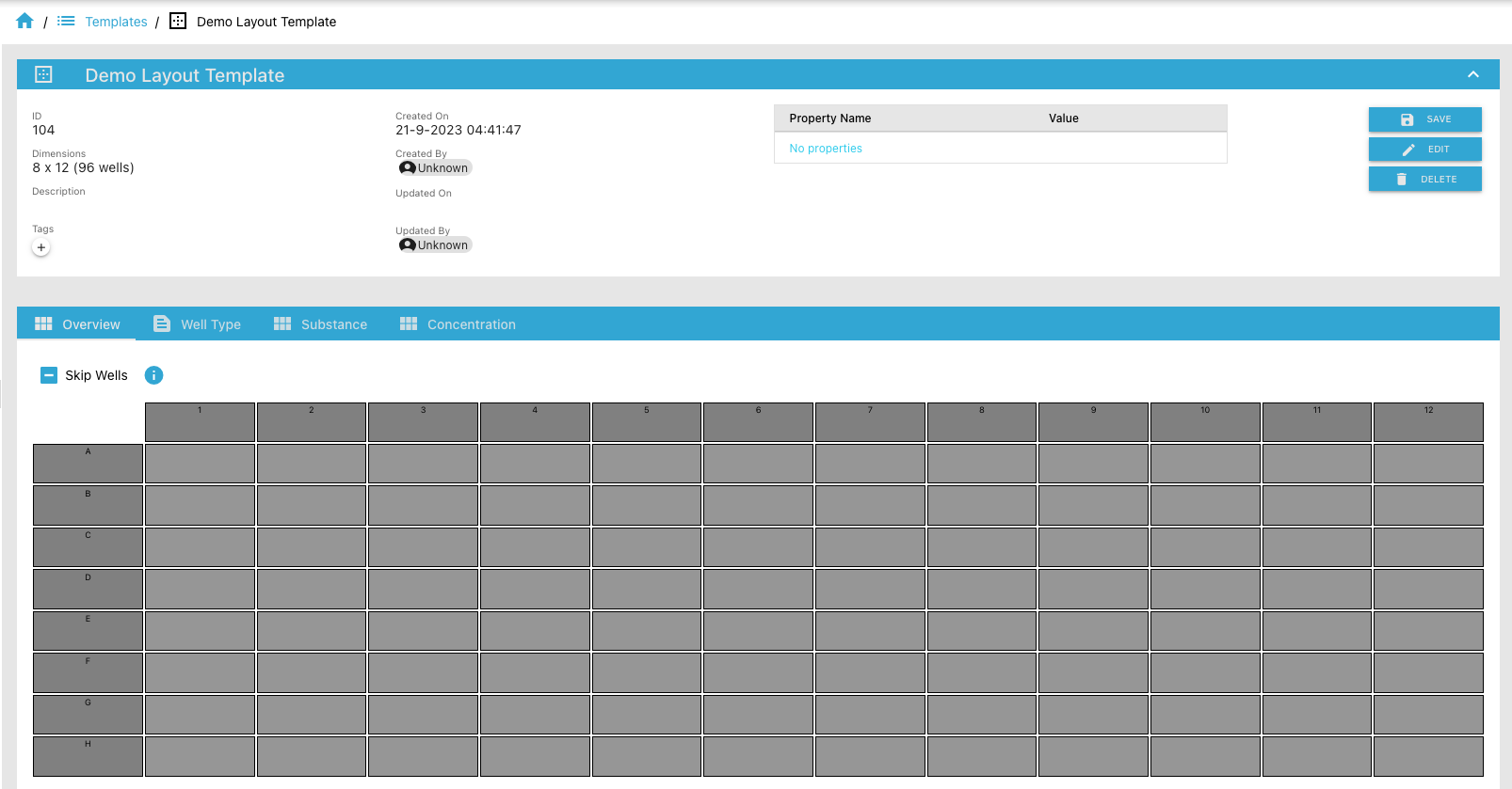 • To view the details of a specific plate layout template click on one of the rows (e.g. previously created)