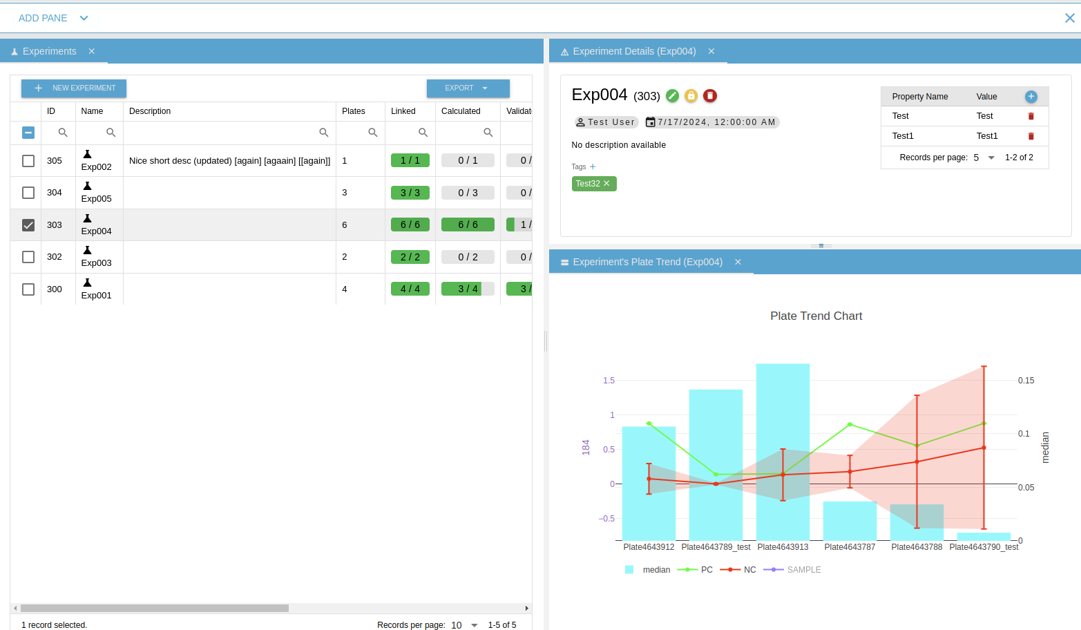 Displays a list of experiments related to the selected projects. If no project is selected, this section will be empty. From this component, you can open the Browse Plates, Experiment Details and Experiment’s Plate Trend
