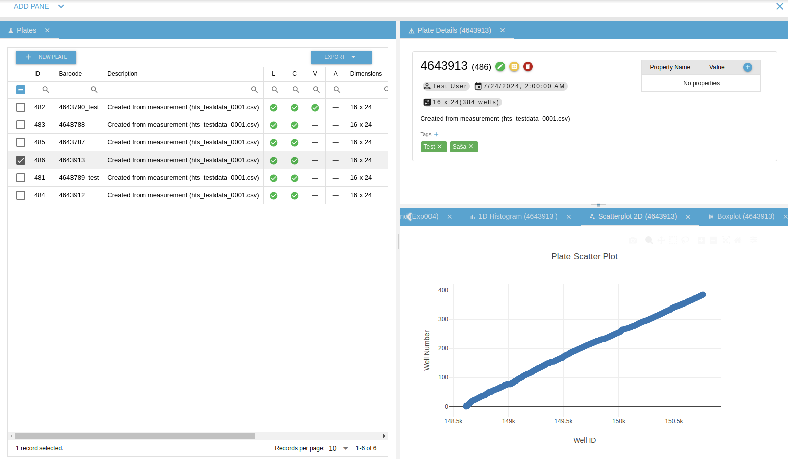 Displays a list of plates related to the selected experiments. If no experiment is selected, this section will be empty. From this component, you can open the Browse Wells, Plate Details, ScatterPlot 2D, Boxplot, 1D Histogram, Experiment’s Plate Trend and Heatmap