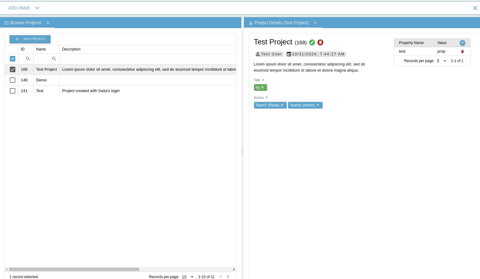 Displays a list of all available projects. From this component, you can open the Browse Experiments and Project Details