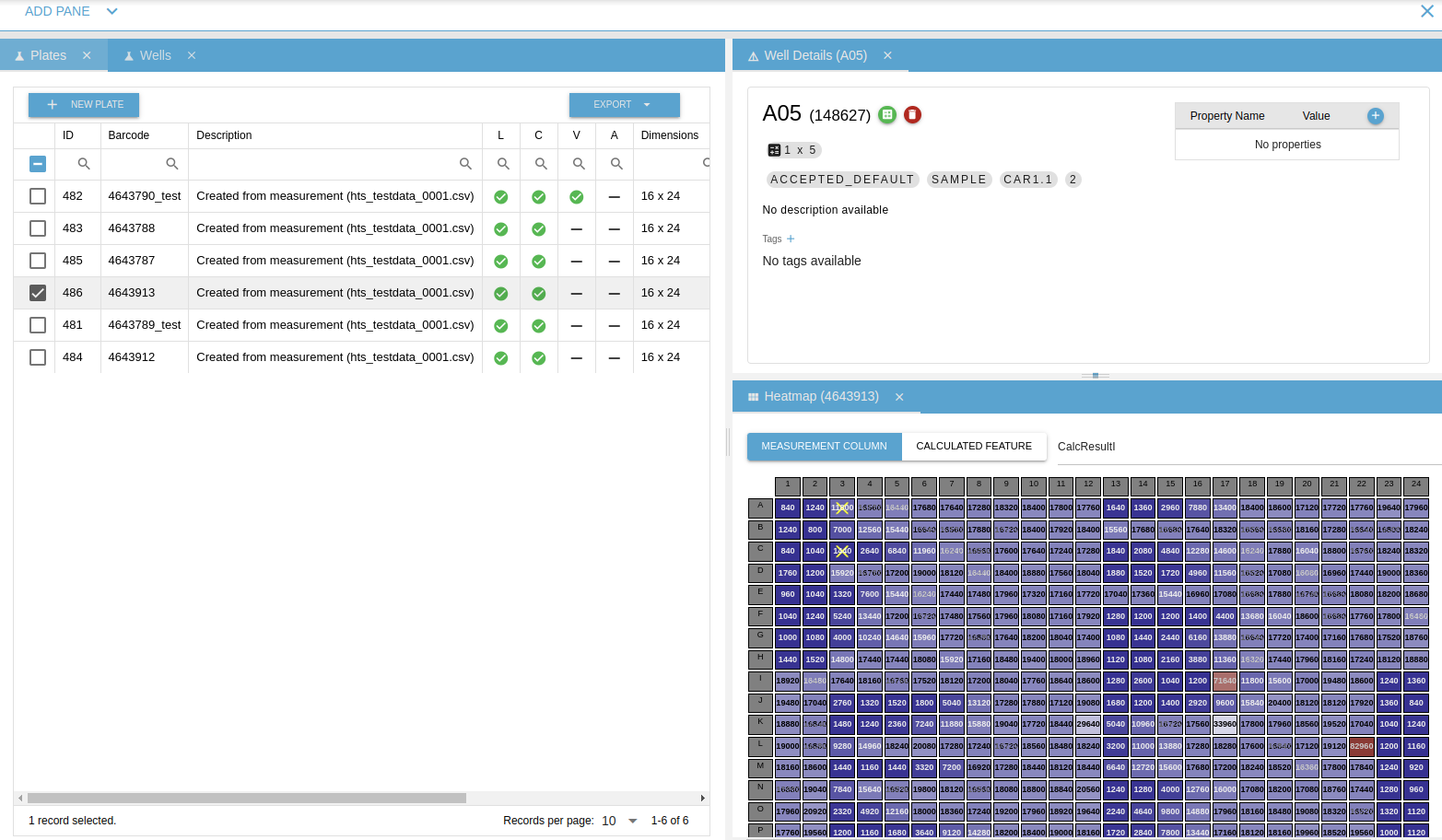 Displays a list of wells related to the selected plates. If no plate is selected, this section will be empty. From this component, you can open the Well Details, and Heatmap