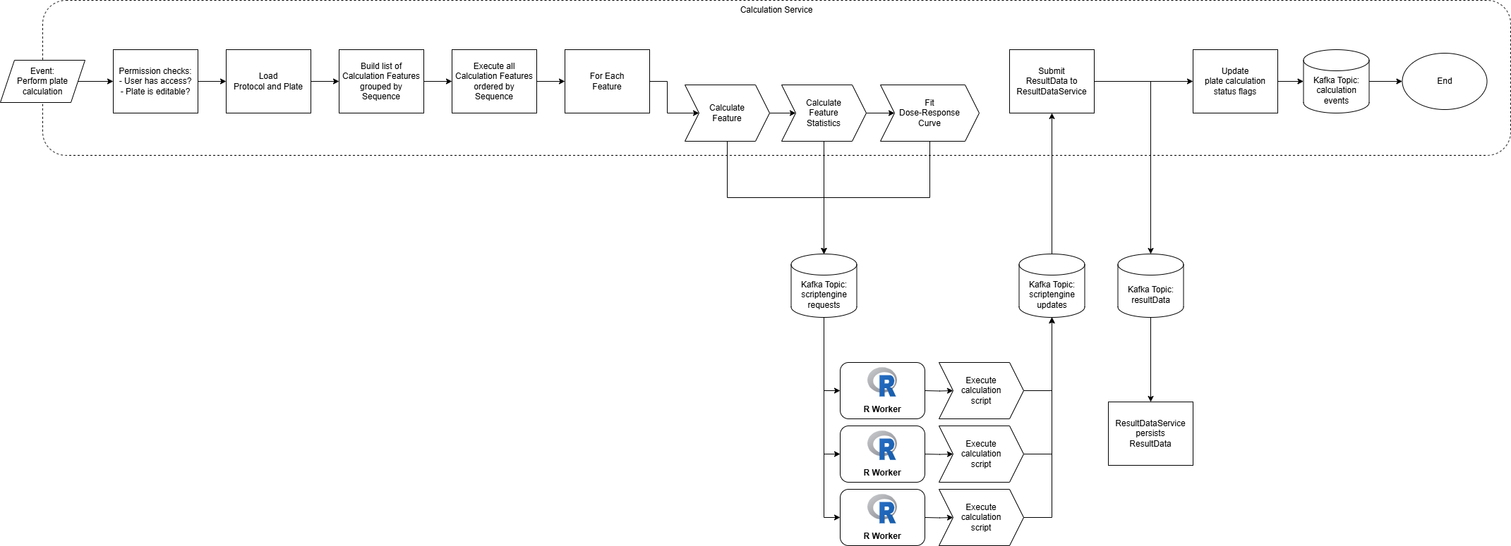 In Phaedra, calculation refers to the execution of a protocol on a plate. The protocol must contain at least one feature and the plate must have an active measurement linked to it. When these conditions are satisfied, the Calculation Service can generate a resultset by calculating all the protocol’s features using the measurement’s data as input.
